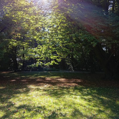 3. Ich liebe lange Schatten, denn sie haben auch etwas, das schützt, verteidigt, manches lebbar macht und überlebbar. Als ich durch den Park laufe, fiel mir auf, dass da ein kleiner Baum neben dem großen Baum heranwächst. Er ist schon fast 80 cm hoch, d.h. er hat schon eine Zeit gehabt zum Anwachsen und Gedeihen. Er wächst am Großen. Wer weiß, ob der Kleine auf der sonnigen Wiese überhaupt überlebt hätte. Vielleicht wäre es verbrannt und an dem vielen Licht zerbrochen? Vielleicht wäre sein Samen ganz leicht von einem Vogel gefressen worden? Der Schatten verhindert also, dass der kleine Baum in seinen ersten Lebensjahren verbrennt und dadurch keine Chance gehabt hätte. Der Schatten ermöglicht Wachstum und Gedeihen. Was für eine Metapher.